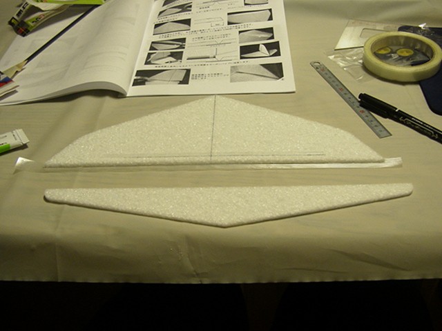 【製作初日】 いよいよ組立です。説明書の順序通りに主翼の組立からスタート! 作るのに一生懸命で 写真撮るの忘れてました(^_^;) 主翼の上反角はそのままでOKだったので特に調整なしで接着 しました。 乾かす間に尾翼の組立です。プラシートの中央に印付けて接着。あとは、グラステープを片方に貼って エレベータを貼付です。 |