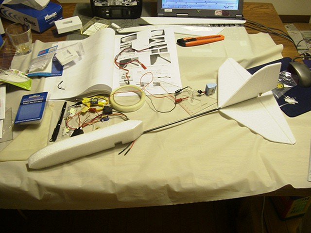 【製作4日目:一応完成!】 いよいよ作業も終盤です。今日の山場は重心あわせとメカ(受信機とかアンプ、バッテリ)の 搭載です。 説明書通り、受信機は胴体を切り抜いて埋め込みました。アンプはノイズの事があったので予防措置 として胴体横にグラステープ貼付しました。(ちょっと美しくないですけど(^_^;) 迷ったアンテナ線は カーボンロッドの外側をリンケージのパイプにあわせて尾翼側にもってきました。余った分は そのままで垂れてます。プロポの説明書には、垂直尾翼の上へと書いてありましたし、スカイモード はカーボンロッドの内側を通ってましたのでどれがいいのか?だったので、とりあえずって感じです。 |