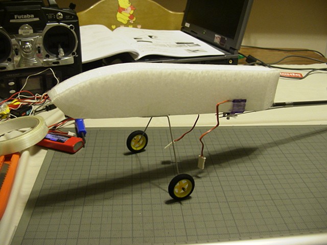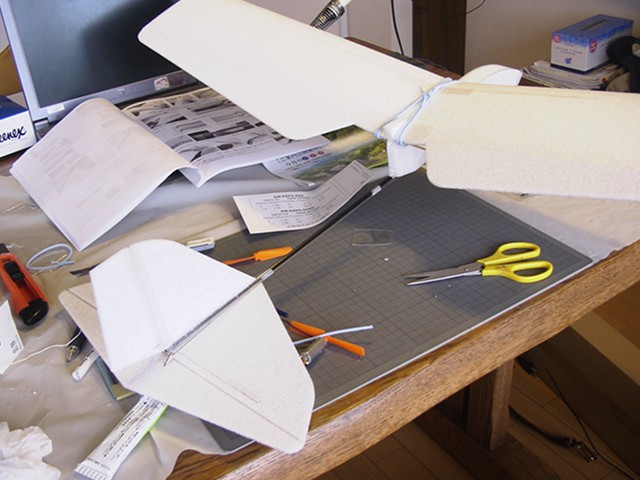 ずれたりとれたりしないかとまたまた不安が残ります。インターネットで調べねば(*^_^*) あとからでもいいんですが、主翼や尾翼のまわりをグラステープで補強するのを先にやっときました。 あとは、 主翼にモーター取り付けて本日の作業は終了です。今日の作業時間も1時間くらいでした(^^)/ 主翼が付いたら飛行機らしくなってきた(^^) |