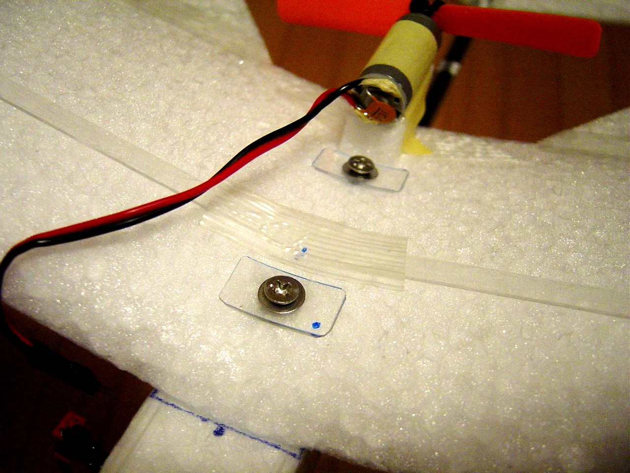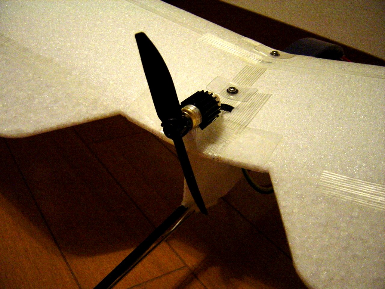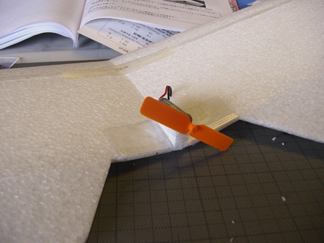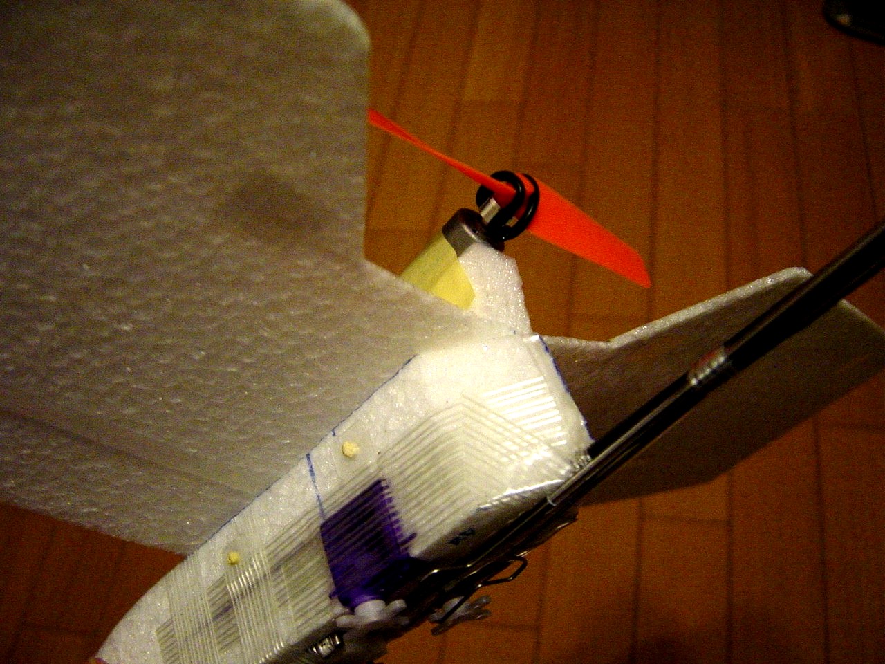 【 モーターの取り付け 】 モーターは、50XCをグラステープで貼付です。モーターマウントは、適当に余ったEPPを切って プロペラがあたらない高さに落ち着けました。スラストとかは、考えてないので飛ばしてみてから 判断できれば変更します。 →たぶんよくはわからないのでこのままかなぁ〜(^^;) |