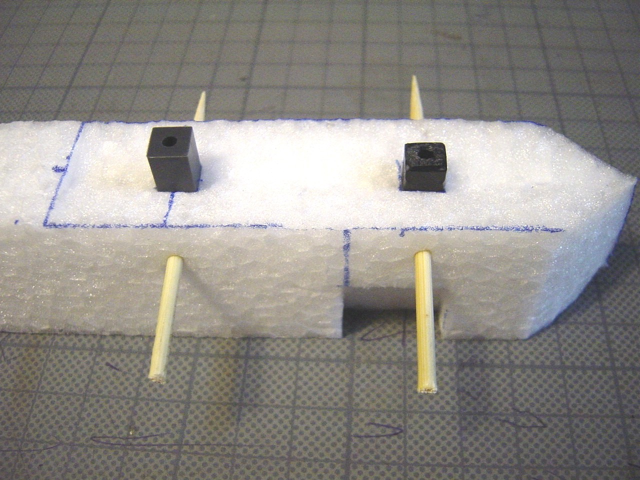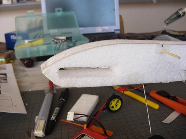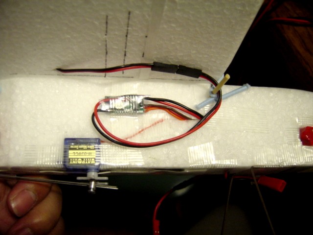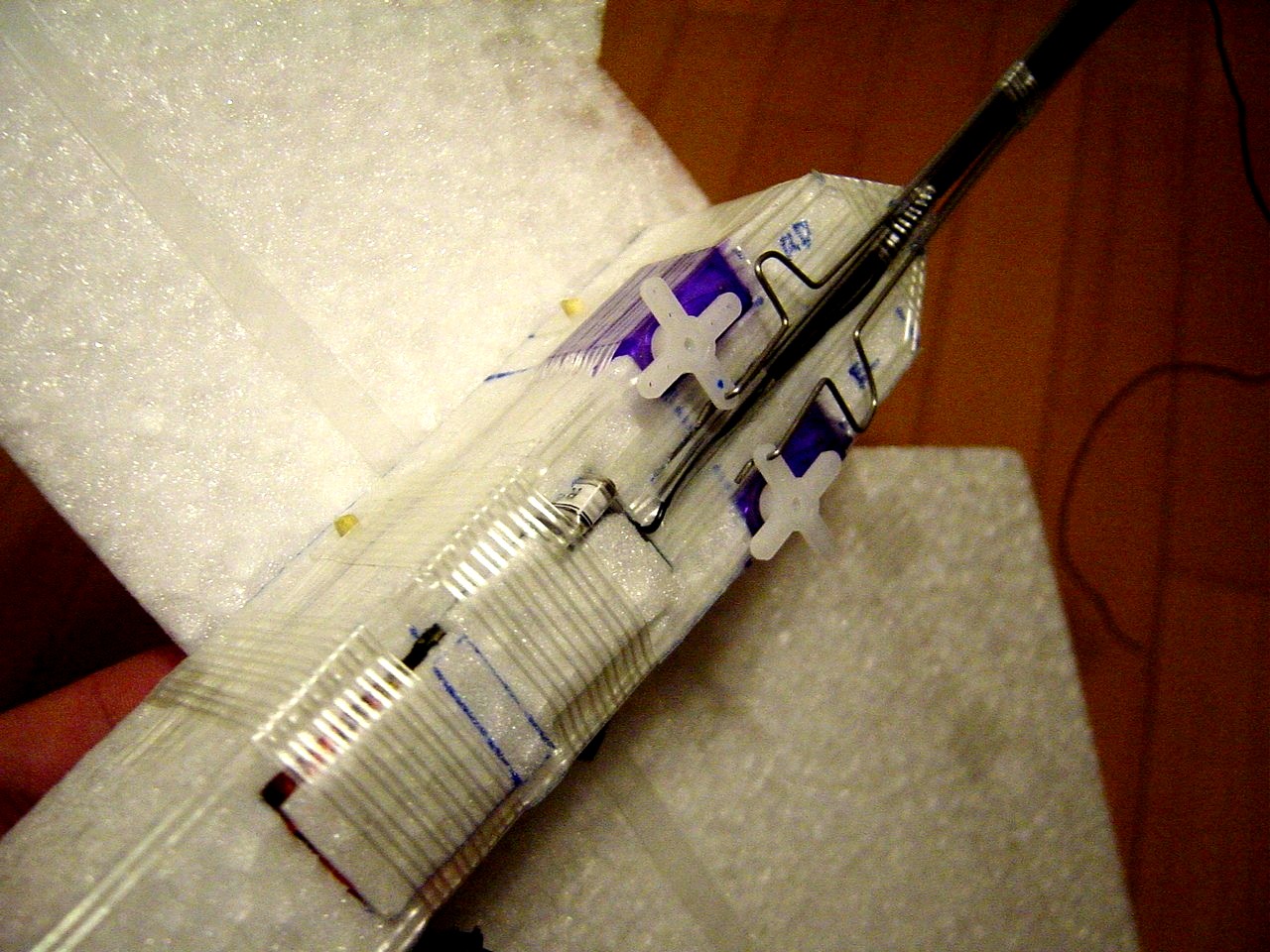 【 モーターの取り付け 】 モーターは、50XCをグラステープで貼付です。モーターマウントは、適当に余ったEPPを切って プロペラがあたらない高さに落ち着けました。スラストとかは、考えてないので飛ばしてみてから 判断できれば変更します。 →たぶんよくはわからないのでこのままかなぁ〜(^^;) |