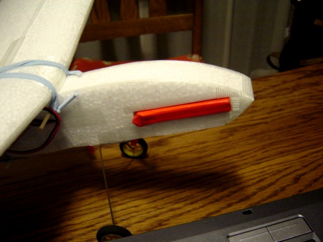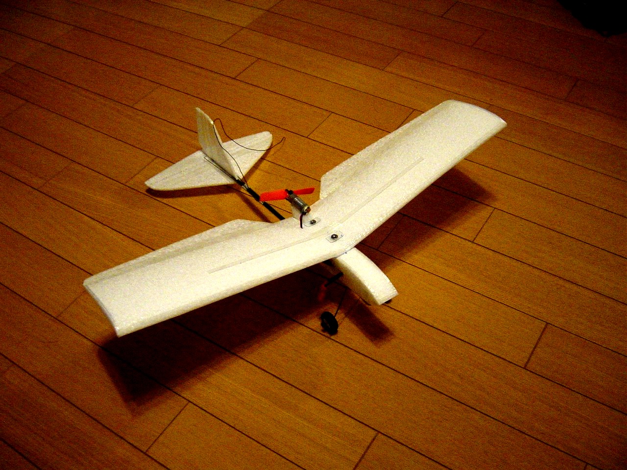 でも悩んでも初心者なので先に進めないため、説明書通りのリポ2セル7.4v-880mAhでやってみました。 するとびっくりです(感動です)説明書通り先端から15mmで初心者重心(前縁50mm)にぴったり 合います(^^)/ 本当にびっくりしました。いままでペーパープレーンでも重心合わすのにおもりや クリップを付けたりはずしたりして何回かは調整が必要だったのに、説明書通りに作るだけでぴったり OKです。横から見た図 本当にぷちトレーナーは(超)初心者にも優しい機体です。設計されたsekiaiさんはすごい方だと思いました。 本当に感謝感激です。(^^) <(_ _)> |