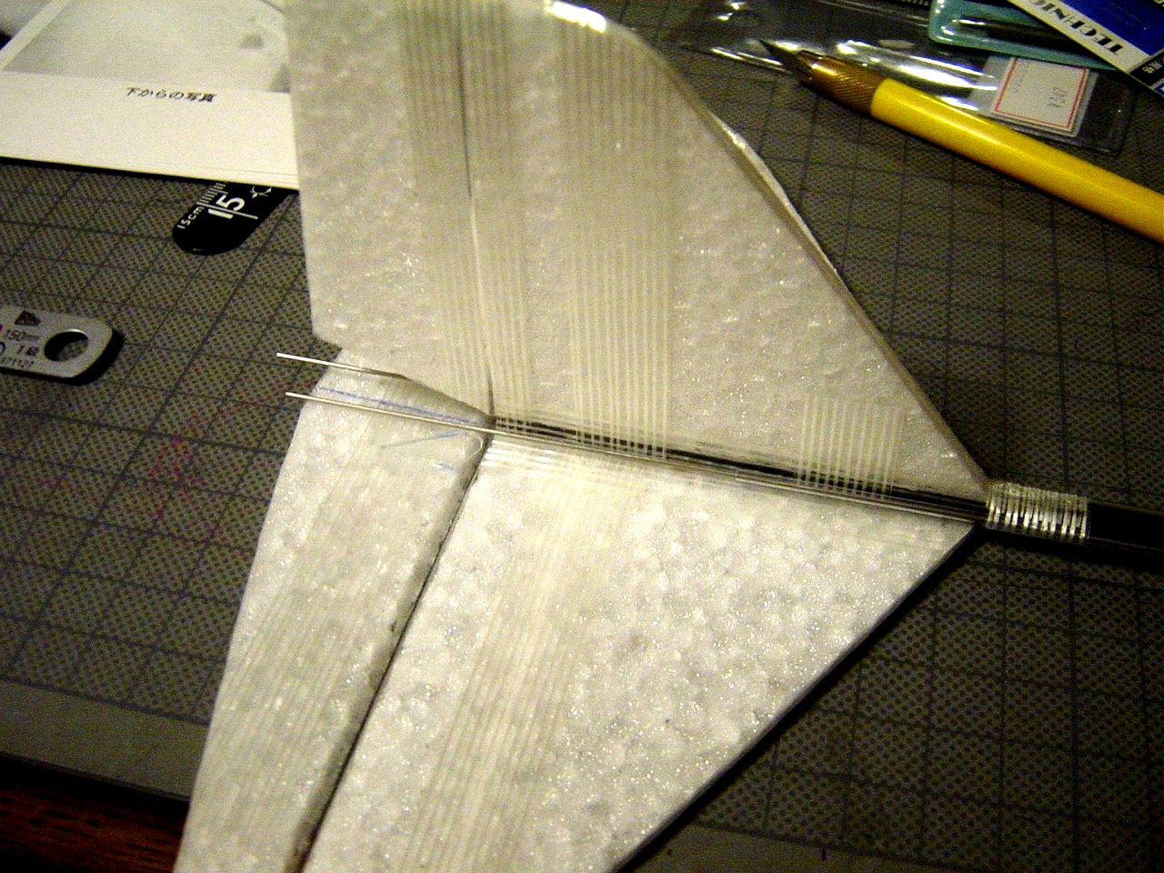 胴体側に指す竹串の位置がよくわからず、適当な場所に主翼の補強と同じ